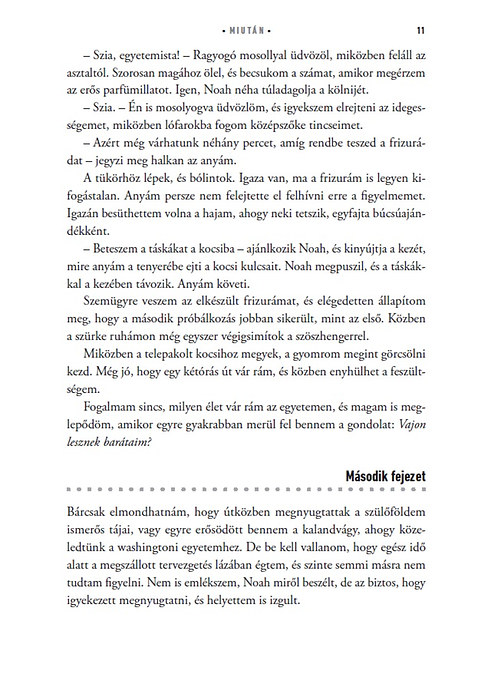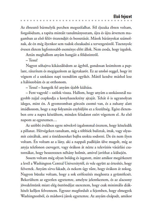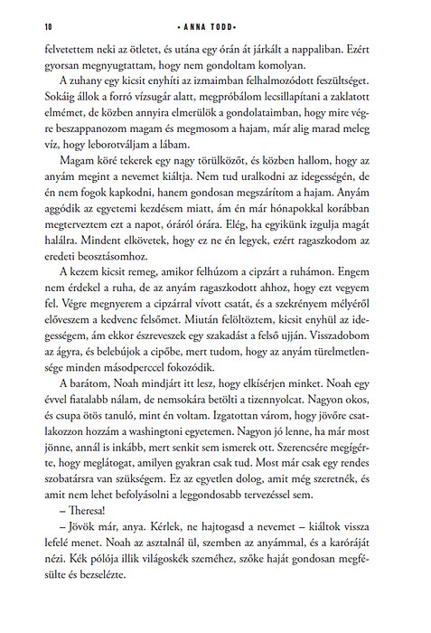 Aztán elsőévesként beköltözik az egyetem kollégiumába, és találkozik Hardinnal. Azonnal feltűnik neki a tetovált, piercinges fiú, aki angol akcentussal beszél, és mindenben különbözik attól, amit Tessa az addigi életében megszokott.