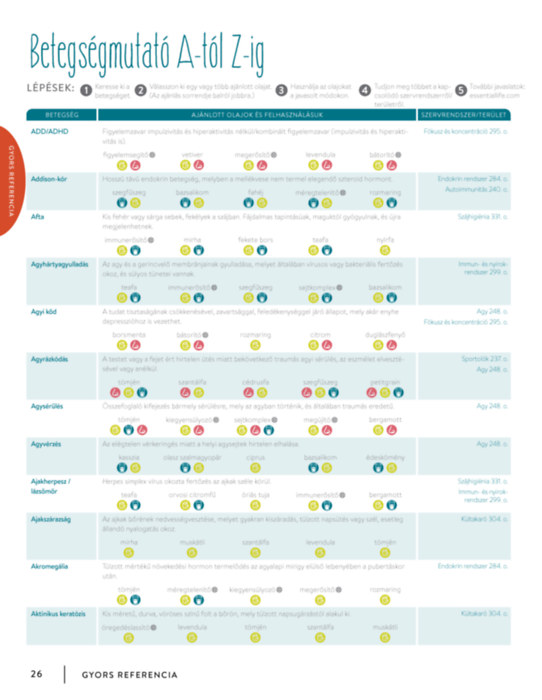 - A Gyors referencia komplex táblázata több mint 500 egészségügyi panaszra ajánl olajokat, könnyen értelmezhető szimbólumai szemléletesen mutatják a felhasználás ajánlott módját.