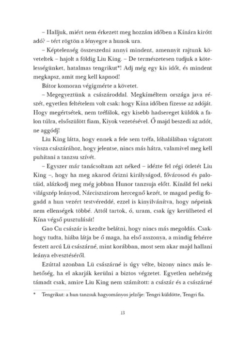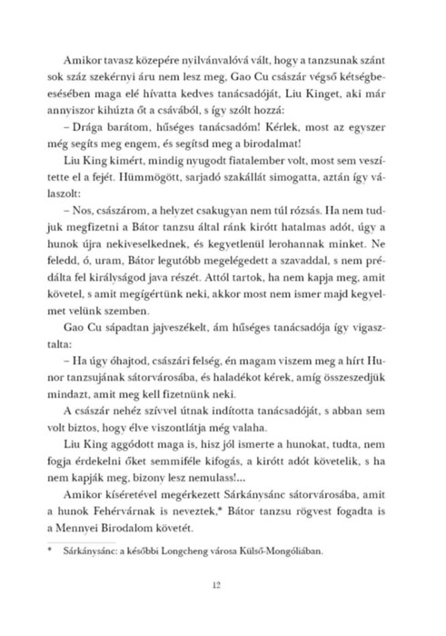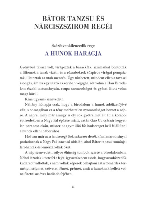 Réges-rég, amikor a hunok még a Nagy Faltól északra éltek, és évszázadokon át háborúban álltak a felemelkedő Kínai Birodalommal, hős vezéreik irányításával vakmerő hadjáratokat indítottak a mesés nyugat és a kies észak irányába. Bátor tanzsu és utódai erős birodalmat hoztak létre maguk is, a korszak minden íjfeszítő népét egyetlen szövetségbe tömörítve. De a sólyom népének és a sárkány nemzetségének háborúja nem csak a harcmezőn dőlt el; a kínaiak ravasz tervet eszeltek ki, hogy térdre kényszerítsék harcias szomszédaikat. A sólyom és a sárkány háborúja című kötet kétezer éves kínai krónikák alapján idézi meg ezt a mesés, számunkra mégis oly ismerős világot.