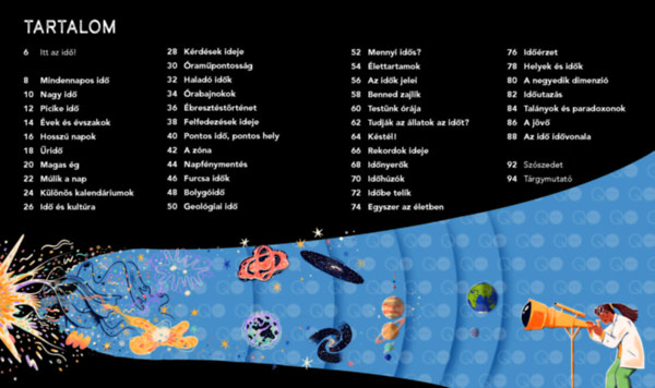 Miért mutat mást az óra a világ különböző részein? Hogyan lehet az idő meghatározásával megfejteni a múltat? Hogyan változott az időről alkotott képünk az idők folyamán? Mikor kezdődött az idő? Vége lesz-e valaha? Az állatok is úgy érzékelik, mint mi? Az idő más bolygókon is ugyanaz? Miért vannak notórius késők? Mi az idő legkisebb egysége? Lehetséges az időutazás? Melyik a legnagyobb óra? meddig tartott egy év a dinoszauruszok korában?