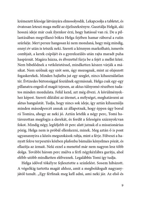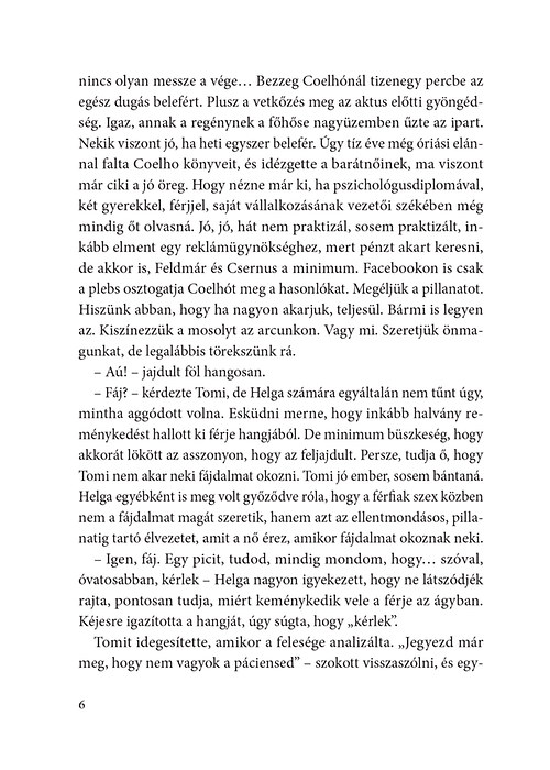 "– Nem gonosz vagyok, hanem őszinte és reális. Ki legyen veled őszinte, ha nem én, a legrégebbi barátnőd, aki mindent végigcsinált veled? Bőven itt az ideje, hogy kimondd a dolgokat. Nem nyafogni kell azon, hogy negyvenéves lettél, hogy jaj istenem, elmúlt a fél életem, jaj istenem, honnan jöttem, hova tartok, hanem el kéne kezdeni a saját jelenedet élni. Beleállni a szembenézésbe. Egyszerűen túllépni bizonyos fájdalmakon, lejönni régi sérelmekről, amelyek fogva tartanak, mint valami kábítószer. Abba kéne hagyni, hogy mindent az anyádra, az apádra, Csabára, Tomira, meg mit tudom én még, kire fogsz! Nem lehetsz passzív elszenvedője az életednek. Te mindig csak mással foglalkozol – Panni nagyon formában volt aznap este. Helga pedig remegett a dühtől. És a végén robbant. – Én? Én foglalkozom mindenki mással? És te? Mikor néztél körül utoljára otthon, nálad?"