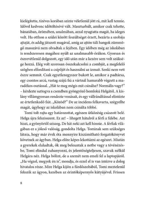 D. Tóth Kriszta új regénye a nagy sikerű Jöttem, hadd lássalak után ismét az emberi kapcsolatok izgalmasan kusza világába kalauzol, ahol minden választás újabb és újabb lehetőség megtalálni magunkban, ami oly fájdalmasan hiányzik. Kísértő múlt, gyötrő kétségek, elfojtott szexualitás, félelmek, szeretethiány, ürességérzés és a nyomában feltörő forró szenvedély: ez jellemzi az egykor pszichológusnak készülő, ma életvezetési tanácsadó céget működtető budai nő, Helga történetét.