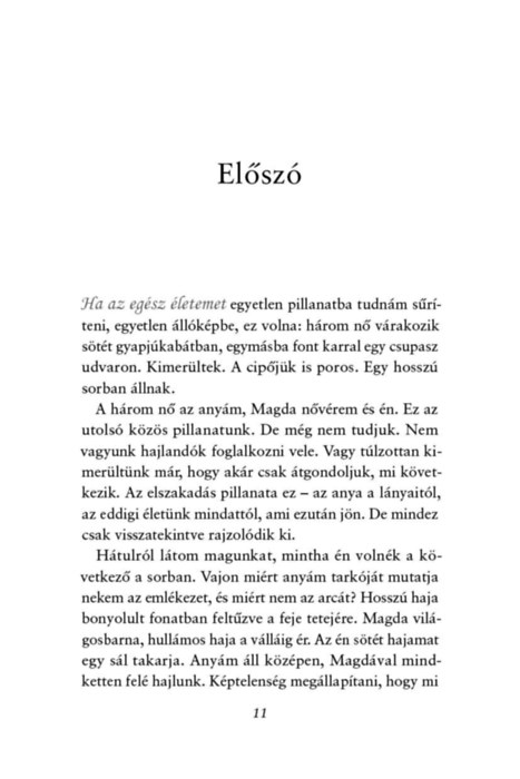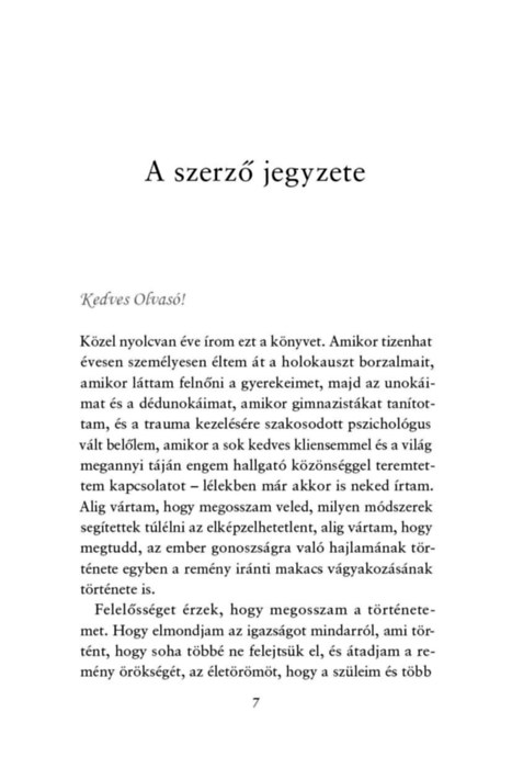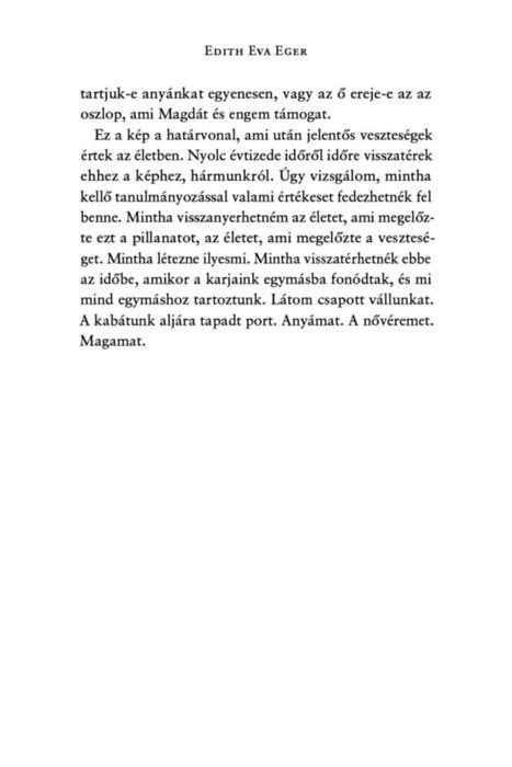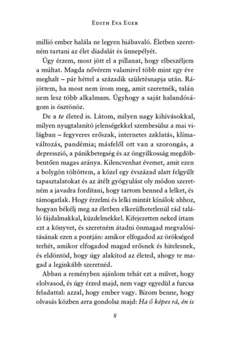 Edith Eva Eger, A döntés és Az ajándék című nagy sikerű kötetek világhírű szerzője új könyvében az újrakezdés egyszerre felemelő és embert próbáló útját ábrázolja egy kamasz lány életében. Editet a legsebezhetőbb korban taszítják a történelem poklába, de szüntelen bizakodása, felelősségtudata, nem utolsósorban pedig a szerelembe és a szeretetbe vetett hite megnyitja előtte a túlélés kapuját. Története mindannyiunknak erőt adhat, mert arra tanít, hogy egy élhető jövő lehetősége még a legreménytelenebb helyzetekben is megcsillanhat. Az élet folytatása inkább tehernek, mint ajándéknak tűnik - egészen addig, amíg Edit fel nem ismeri, hogy mindig van választása. A múltat nem tudja megváltoztatni, de eldöntheti, miként akar élni, újra szeretni.