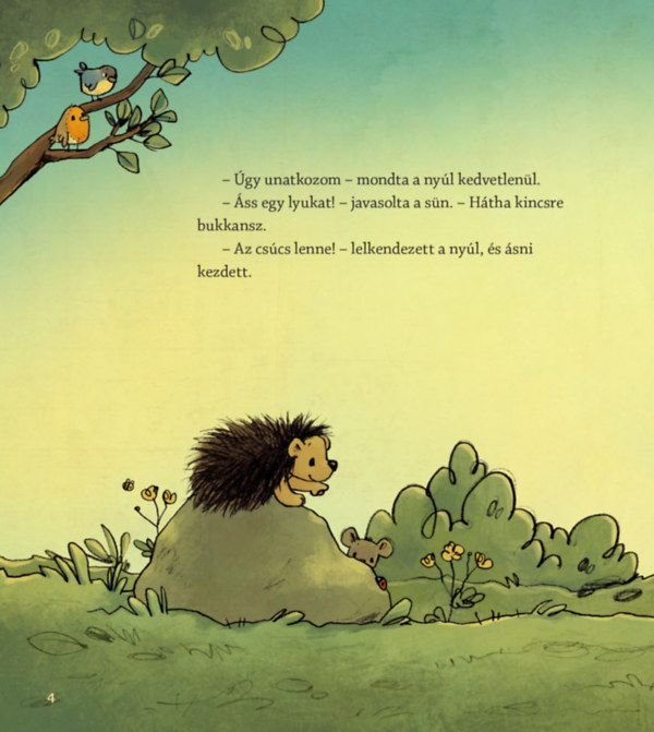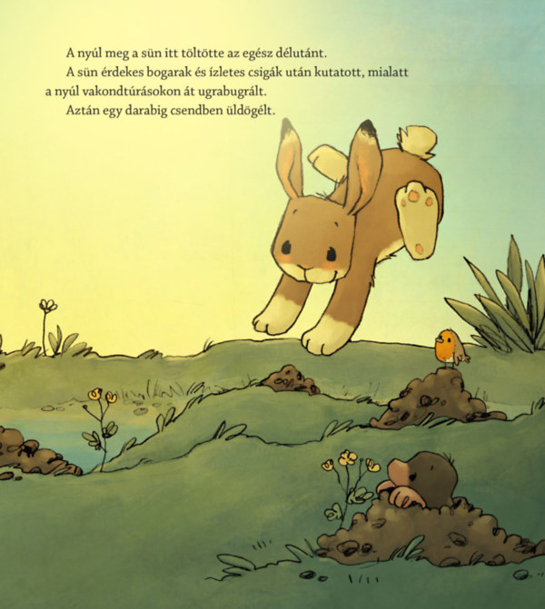 Érdemes összeveszni egy érdekes gyökér miatt? Mi lehet a fűben talált tojásban? És mi a teendő, ha a bokrok mélyén furcsa árnyékokat látnak? A nyúl és a sün mindig mindenben számíthatnak egymásra, sem a távolság, sem a veszekedés nem állhat útjába a barátságuknak. Már csak egy postásra van szükségük, aki hozza és viszi a leveleiket. Vajon ki vállalja el a feladatot?