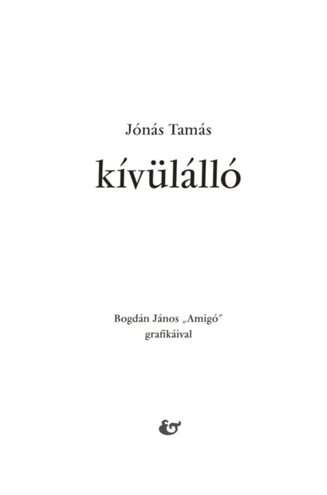 "Hosszas hallgatás után jelentkezik új kötettel Jónás Tamás (1973), akit pályakezdőként József Attila költészetének kortárs továbbgondolójaként tartott számon a kritika. A kilencvenes-kétezres években folyamatosan jelentek meg könyvei, amelyek jelentős szakmai figyelmet és elismerést kaptak. 2002-ben Esterházy Péter ajánlására Herder-ösztöndíjban részesült, 2009-ben Önkéntes vak című kötete Aegon-díjat kapott. Prózakötettel utoljára 2013-ban jelentkezett (Apuapuapu), verseskötettel pedig 2016-ban (Törzs). Hét év után a Kívülálló című regényével töri meg a csendet. "Kívülállónak lenni nem választás kérdése. A kívülállás bélyeg. És lehetőség. Mindig másik, mindig új perspektíva. Kényszeres távolságtartás. Az intimitás kétségbeesett keresése. Érzéki, gátlástalan erotikus kaland, miközben fegyelmezett szellemi feladat. Megzabolázhatatlan szabadság, gyilkos függés. A valóság mélye, széle, párlata. Jónás Tamás regénye az emberi sodródás elkerülhetetlen, felfüggeszthetetlen örvényébe vezet be, hogy megmutassa a szabályszerűségeket, a képleteket. Hogyan válik a jó szándék gyilkos hazugsággá. Közömbös, elejtett szavakból hogyan jegecesedik ki a lényeg. És hogyan tisztulnak ki, lényegülnek át a legszennyesebb, legfülledtebb és legreménytelenebb történetek is, ha van ezekhez elég bátor szó és elég pontos mondat. A Kívülállóban van. Ez a regény addig merészkedik, ameddig irodalom merészkedhet, hogy megajándékozza olvasóit azzal, amiben még bíznak, amit még remélnek. És azzal is, amiben már nem bíznak és nem reménykednek." - Parászka Boróka -"
