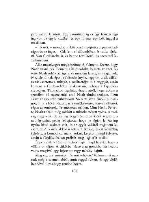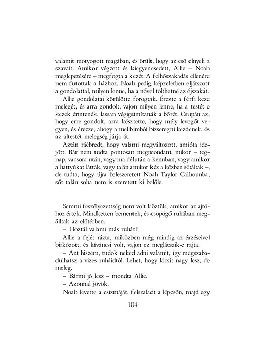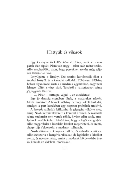 A mű a végtelen szerelem szívszorítóan gyengéd története. 1946-ban, Észak-Karolinában kezdődik, amikor Noah Calhoun visszatér a második világháborúból. A harmincegy éves férfi, miközben megpróbálja birtokát felvirágoztatni, folyton egy gyönyörű lányra gondol, akivel tizennégy évvel korábban találkozott, és akit eddig mindenkinél jobban szeretett. Az emlékeinek él, egészen addig, amíg a lány meg nem érkezik a városba. Mi történt velük az elmúlt években, és hogyan alakul további életük? Mindezt megtudhatjuk e páratlanul szép, mesterien szőtt, megrendítő és igaz szerelmi regény lapjairól.