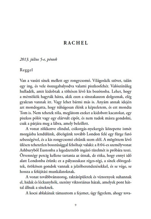 2015 elején Paula Hawkins regénye berobbant az angolszász piacokra. Ahogy Stephen King fogalmazott, ebben a történetben csak fokozódik és fokozódik a feszültség. Nem véletlenül hasonlítják Hitchkockhoz és Agatha Crhristie-hez az írót, a Gone girlhez a történetet.