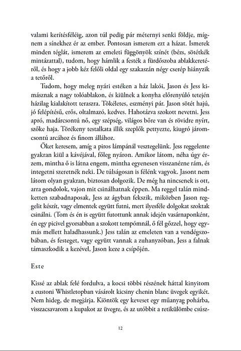 Igazi lélektani thriller! Ahogy egyre mélyrehatóbban megismerjük a három nő életét, feltárulkozik az olvasó előtt egy amolyan "Desperate Housewives" kaliberű, a szálakat jól megkavaró "lila akác közi" miliő, amiben senki sem az, akinek elsőre látszik. A történet főszereplője a sztori végéig az alkohol, önmaga és exférje lelki rabszolgája és maga sem tudja, hogy valban bűnös-e vagy "csak" áldozat, mint a legtöbb heparátor...