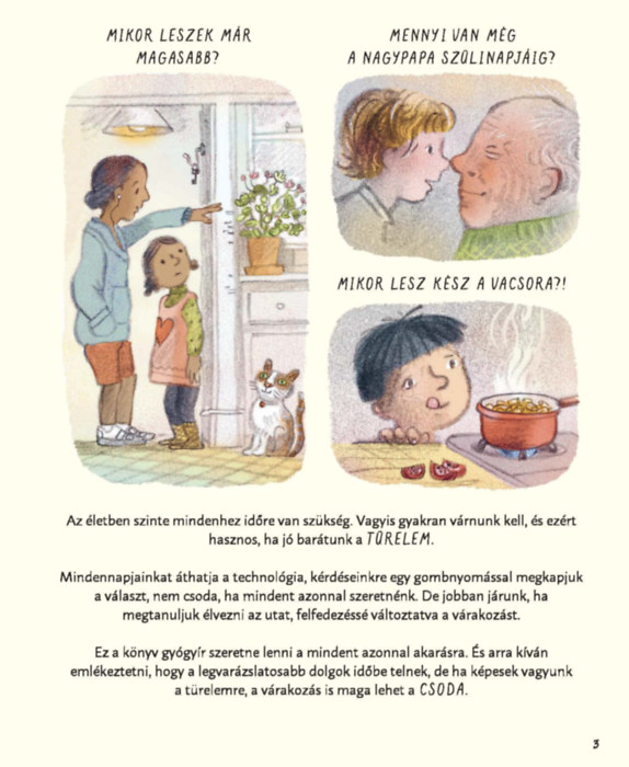 Az életben szinte mindenhez időre van szükség. Vagyis gyakran várnunk kell, és ezért hasznos, ha jó barátunk a türelem. Mindennapjainkat áthatja a technológia, kérdéseinkre egy gombnyomással megkapjuk a választ, nem csoda, ha mindent azonnal szeretnénk. De jobban járunk, ha megtanuljuk élvezni az utat, felfedezéssé változtatva a várakozást. Ez a könyv gyógyír szeretne lenni a mindent azonnal akarásra. És arra kíván emlékeztetni, hogy a legvarázslatosabb dolgok időbe telnek, de ha képesek vagyunk a türelemre, a várakozás is maga lehet a csoda.