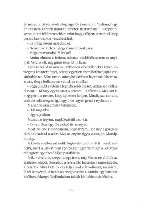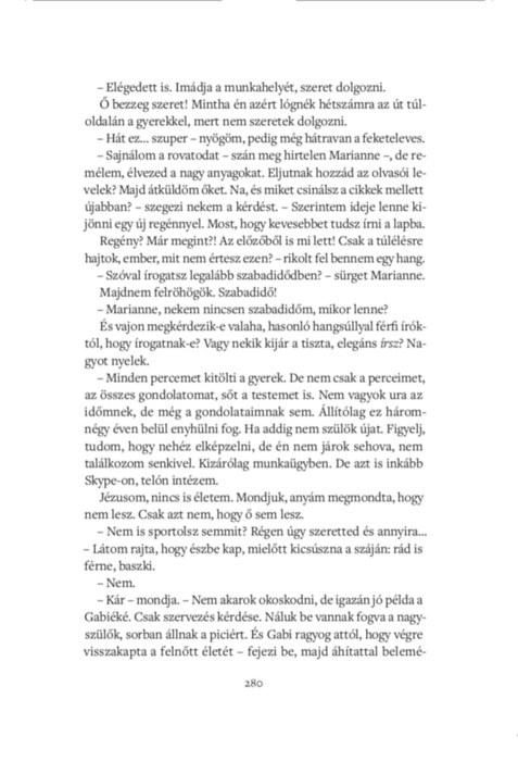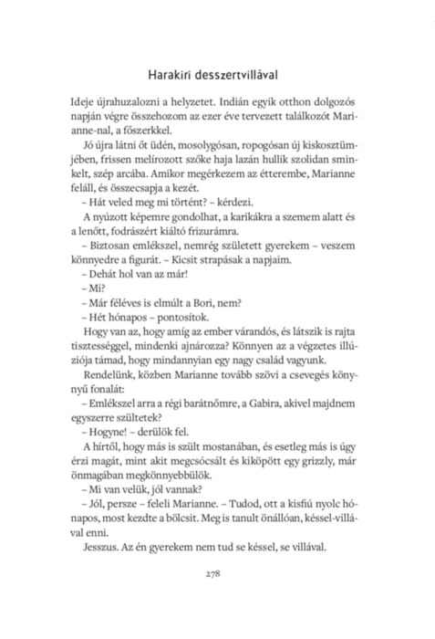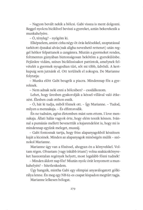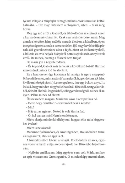 ZSENIÁLIS, tényleg! Minden szabad percben hanyatt vágtam magam az óriási fotelben keresztbe, és olvastam, röhögtem, kínomban és felszabadultan, együttéreztem, izgultam, felháborodtam – szóval szerettem, nagyon. Iszonyatosan jól megfogta a témát, és csomó fontos ügyet von be úgy, hogy mélyen emberi marad az egész, és cseppet sem kioktató vagy mindent jobban tudó, vagy általánosító.