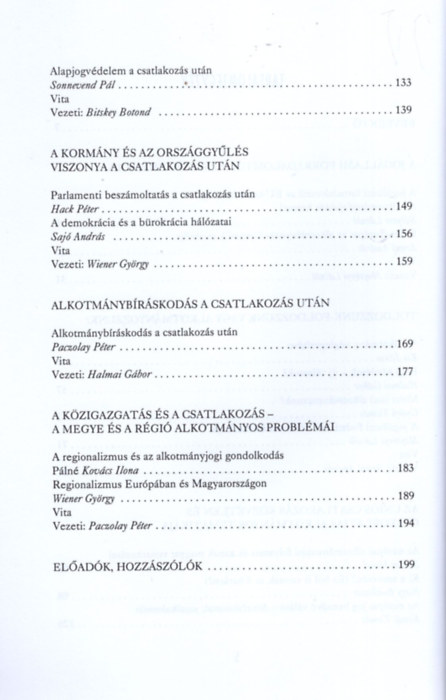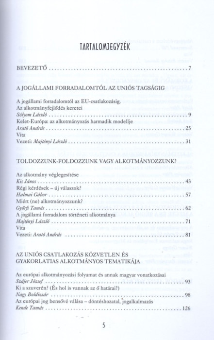 A kötet az Európai Unióhoz csatlakozó Magyarország alkotmányjogi helyzetét elemzi. Az első rész az alkotmányfejlődést, azaz a jogállami forradalomtól az uniós tagságig megtett történelmi utat tekinti át. az 1989-es évtől az EU csatlakozás időpontjáig. A kötet Toldozzunk, foltozzunk vagy alkotmányozzunk? című részében azt a kérdést járja körül, hogy kell-e új most alkotmányt alkotni: vagy sem. A második rész az uniós csatlakozás közvetlen és gyakorlatias alkotmányos tematikájához igazodik az alábbi témakörökkel: Ki a szuverén? Az EU alkotmányozó konventje működésének lehetséges következményei a magyar alkotmányosságra – milyen módosításokat tehet szükségessé a tervezett uniós alkotmány? A belső jog és az Európai Unió joga, nemzetközi szerződések az alkotmányban A kormány és az Országgyűlés viszonya a csatlakozás után Alkotmánybíráskodás a csatlakozás után A közigazgatás és a csatlakozás – a megye és régió alkotmányos problémái A kötet szerzői: Sólyom László, Kis János, Szájer József, Sajó András, Halmai Gábor, Hack Péter,Majtényi László, Arató András, Bragyova András, Győrfy Tamás, Kende Tamás Nagy Boldizsár, Paczolay Péter, Pálné Kovács Ilona, Sonnevend Pál, Wiener György.