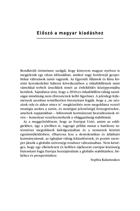 Sophia Kalantzakos könyve a ritkaföldfémek globális ellátási láncában monopóliumot szerző Kína esettanulmányán keresztül mutatja be, hogyan állíthatók gazdasági eszközök geopolitikai célok szolgálatába. A nyersanyagok ellenőrzése és a háborítatlan ellátás fenntartása a szerző által bemutatott történelmi példákban is kulcsfontosságú volt, ám a kínai állam gazdasági szerepvállalása új kihívások elé állította a globális gazdaság többi állami szereplőjét.