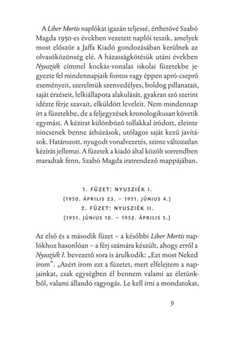 Vonalas irka, rajta a cím: Nyusziék I. Ilyen közönséges iskolai füzetekbe írta Szabó Magda 1950 és 1958 között most felfedezett és még soha nem publikált naplóit, férje, Szobotka Tibor és önmaga számára, hogy ne felejtse el napjaikat, az együtt töltött boldog pillanatokat:,,Mindennap írnom kellene ebbe a füzetbe, rögzítenem a mosolyodat, a szádat, szavaid, az ölelésedet."