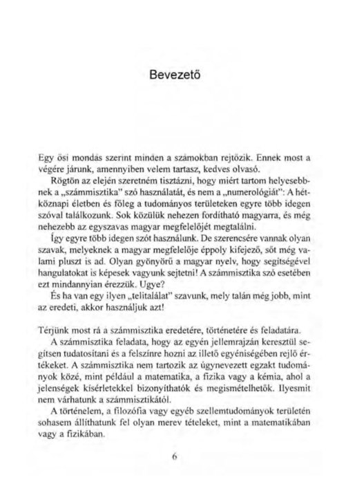 Ez a könyv arra vállalkozik, hogy bevezesse az Olvasót a számmisztika rejtelmeibe, melynek segítségével feltárhatjuk személyiségünk titkait. Az érdeklődő olyan gyakorlati kézikönyvet tart a kezében, amely olvasmányosan, közérthető szerkezettel, játszva tanít.