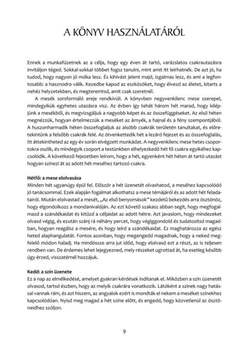 A mesék a csakrák sorrendjében követik egymást. A negyvenkilenc mese hetes csoportokra oszlik, minden csoport a testünkben elhelyezkedő hét fő csakra egyikéhez kapcsolódik, feldolgozva annak témáját. A könyv segít, hogy elmélyítsük intuitív erőinket, mélyebb szinten kapcsolódjunk másokhoz és felismerjük a bennünk rejlő legmagasabb szintű képességeket. A feladatok kezünkbe adják az életünk megváltoztatásához szükséges spirituális eszközöket, hogy megteremtsük mindazokat a változásokat az életünkben, amelyekre valóban vágyunk. A mesék legfontosabb üzenete: nincs lehetetlen!