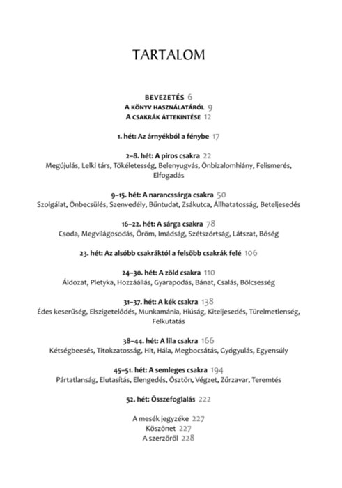 Legújabb könyvében Tori Hartmann varázslatos csakrautazásra invitál. Az 52 héten át tartó belső munka A csakrák bölcsessége című kártyacsomagból ismert és kedvelt mesékre épül. A teljes terjedelmükben megjelenő mesék sorsformáló ereje rendkívüli. A könyvben negyvenkilenc mese szerepel, mindegyikük egyhetes utazásra visz. Az évben így tehát három hét marad, hogy kilépjünk a mesékből és megvizsgáljuk az összefüggéseket. Az egyes napok feladatai a következők: