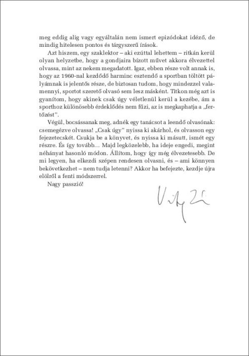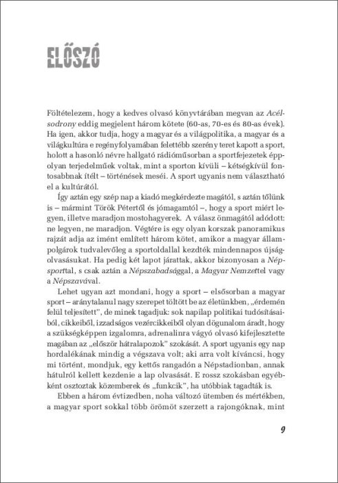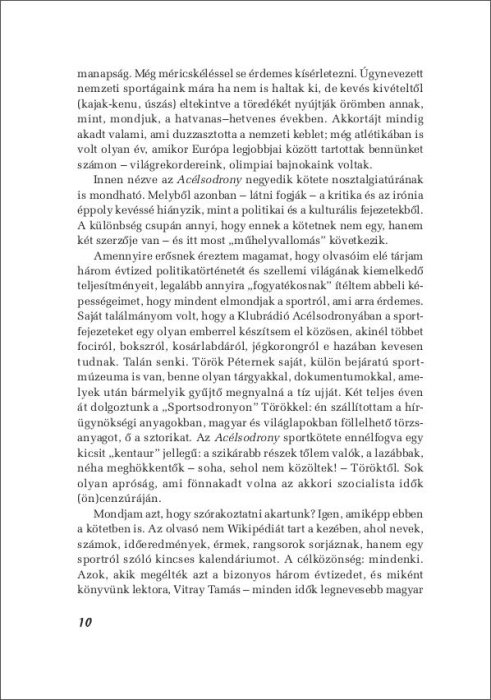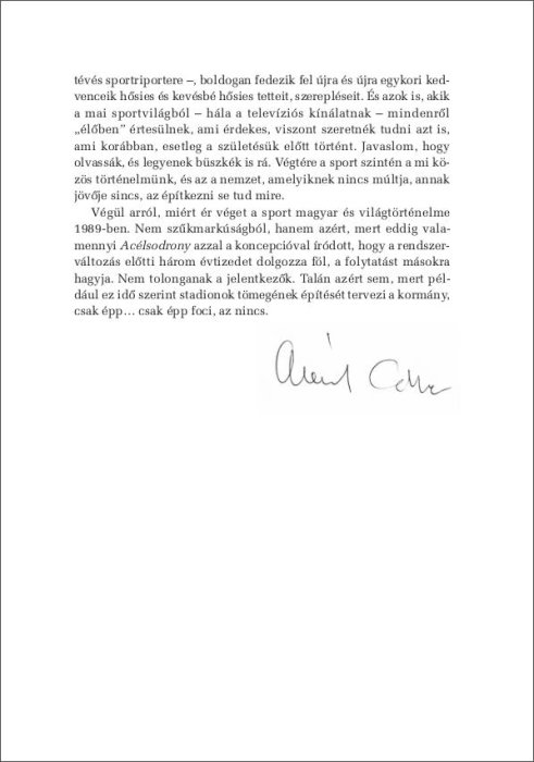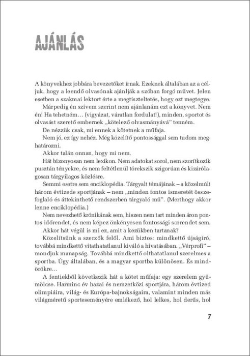 Ebben a három évtizedben, noha változó ütemben és mértékben, a magyar sport sokkal több örömet szerzett a rajongóknak, mint manapság. Még méricskéléssel se érdemes kísérletezni. Úgynevezett nemzeti sportágaink mára ha nem is haltak ki, de kevés kivételtől (kajak-kenu, úszás) eltekintve a töredékét nyújtják örömben annak, mint, mondjuk, a hatvanas-hetvenes években. Akkortájt mindig akadt valami, ami duzzasztotta a nemzeti keblet; még atlétikában is akadt olyan év, amikor Európa legjobbjai között tartottak bennünket számon - világrekordereink, olimpiai bajnokaink voltak. Hogy kinek ajánljuk? Azoknak, akik megélték azt a bizonyos három évtizedet, és miként könyvünk lektora, Vitray Tamás - minden idők legnevesebb magyar tévé-sportriportere -, boldogan fedezik fel újra és újra egykori kedvenceik hősies és kevésbé hősies tetteit, szerepléseit. És azoknak is, akik a mai sportvilágból - hála a televíziós kínálatnak - mindenről „élőben” értesülnek, ami ma érdekes, viszont szeretnék tudni azt is, ami korábban, esetleg a születésük előtt történt. Javaslom, hogy olvassák, és legyenek büszkék is rá. Végtére a sport ugyancsak a mi közös történelmünk, és az a nemzet, amelyiknek nincsen múltja, annak jövője sincs, az építkezni se tud mire.