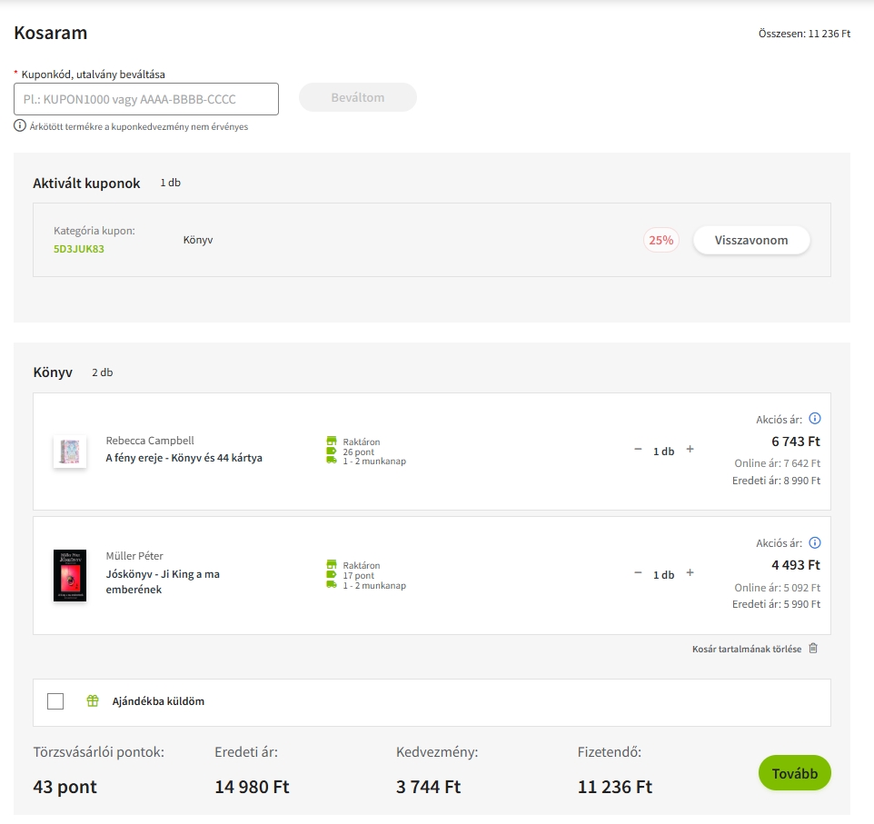 Az aktiváláshoz lépj be fiókodba a Bookline oldalán, tedd kosaradba a kiválasztott termékeket, majd a Kosaram oldalon található Kuponkód, utalvány beváltása mezőbe írd be a 5D3JUK83 kódot! Ezt követően a könyvek mellett a kedvezményes ár jelenik meg.