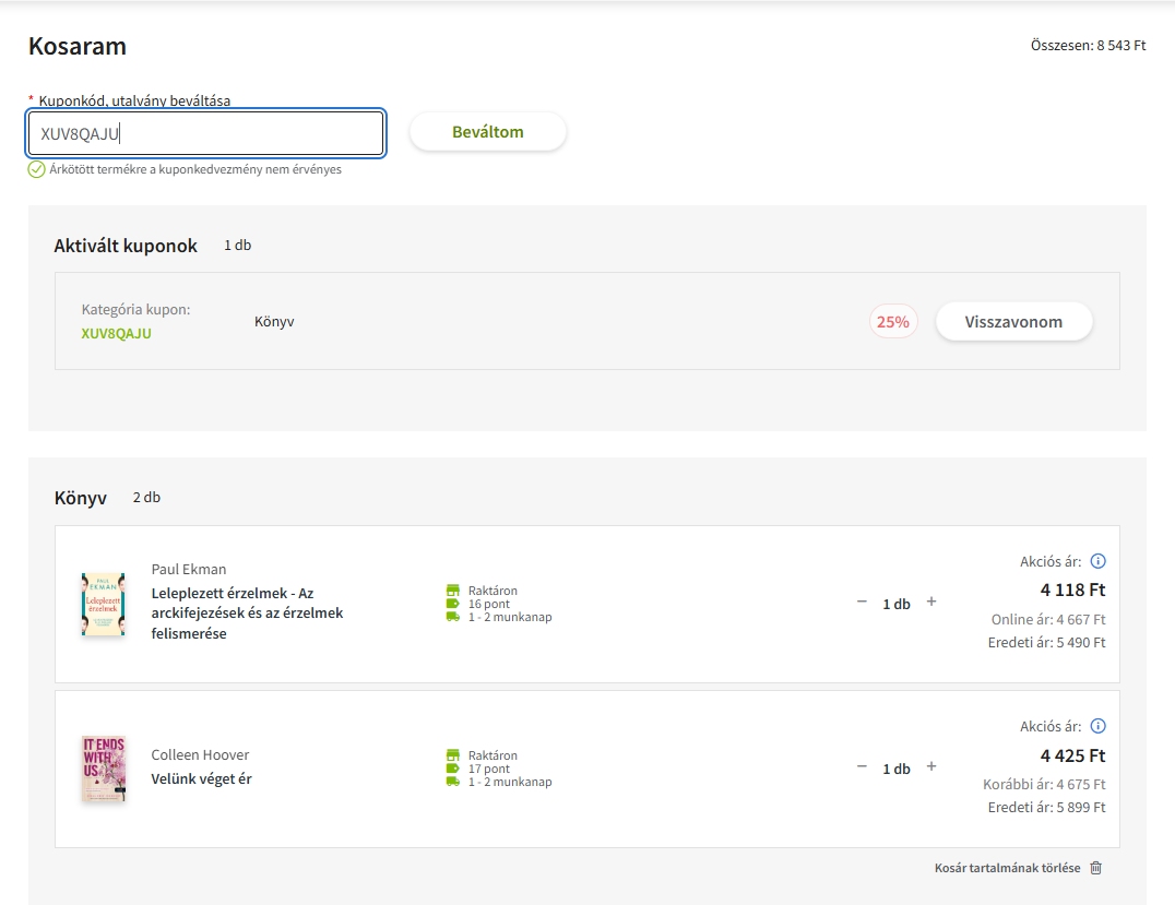 Ajánlatunk kizárólag a Könyv kategória termékeire érvényes, két alkalommal használható fel. Az akció e-könyvekre, e-hangoskönyvekre, antikvár könyvekre, idegen nyelvű könyvekre, ajándékkártyákra és utalványokra nem vonatkozik. A kedvezmény csak az alapkedvezményű termékekre vonatkozik, amelyek mellett az Online ár megnevezés található, akciós illetve Kiadói áras termékek megvásárlása esetében nem használható. A kedvezmény az Eredeti árból kerül levonásra.