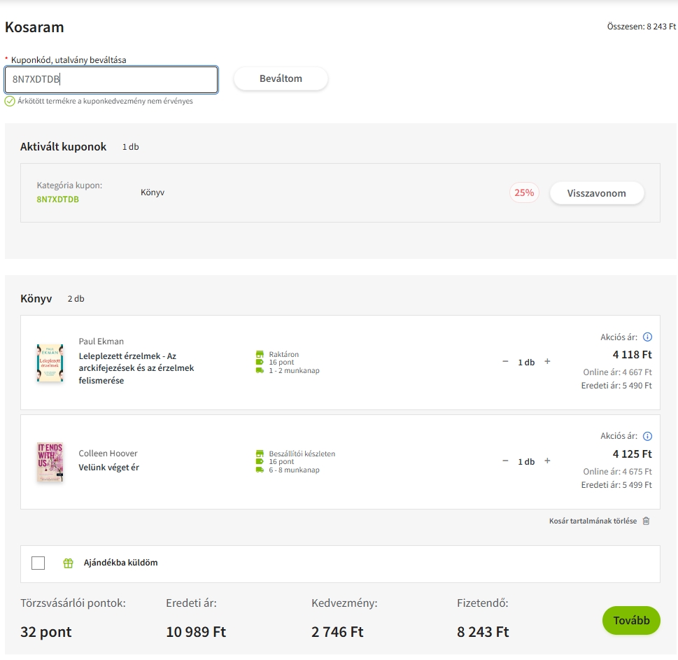 Szeretnénk megajándékozni egy igazán értékes ajándékkal, egy 25%-os kedvezménykuponnal! Személyes kuponoddal annak érvényességi ideje alatt 25% kedvezménnyel vásárolhatod meg a Könyv kategóriában található valamennyi új, magyar nyelvű könyvet, amelyek mellett az Eredeti ár plusz Online ár megnevezés található.